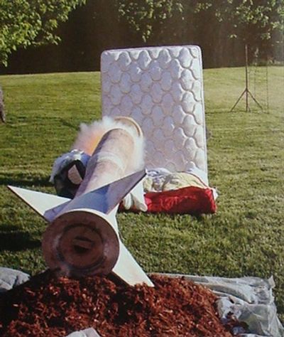 Eight grams of BP was called for by the calculator, and that is what we used. Mike Law and I set up the “test stand”—an old mattress leaning up against a well-worn picnic table. Mike put layers of sleeping bags on the ground to try to help protect the 15-pound combo nose cone/altimeter bay during our tests. I grabbed a tarp and Travis and I shoveled mulch into a wheelbarrow. We dumped the mulch about ten feet away from the “test stand.” Mike set up a lawn chair to lift the front end of the rocket up from the ground. The mulch was used as a cushion for our precious fin can. At this stage of the game we couldn’t afford any damage to it during our ejection charge tests.