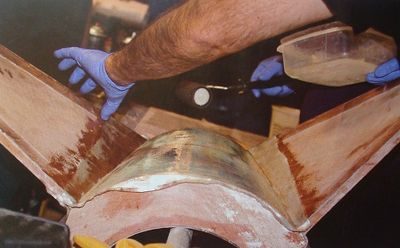 After the fins were cut, we needed to seal all of the exposed edges. We chose to do this by cutting rabbets into strips of Okoume to form T-shaped caps. Each of the T-caps were mitered, fit, and then epoxied into all of the exposed fin edges. Once the caps were in place, we covered the fins in three-ounce fiberglass. The edges were wrapped with an additional three ounces of glass.