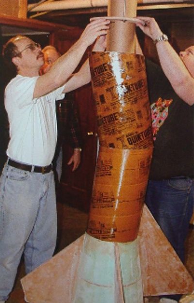 The templates were very helpful in marking the body tubes. However, through human error on our part, they didn’t quite scale up correctly. Each body tube had to be adjusted slightly “on the fly,” and our center of pressure (CP) had to be recalculated. Once we were happy with the fit, the tubes were covered with one layer of six-ounce fiberglass.