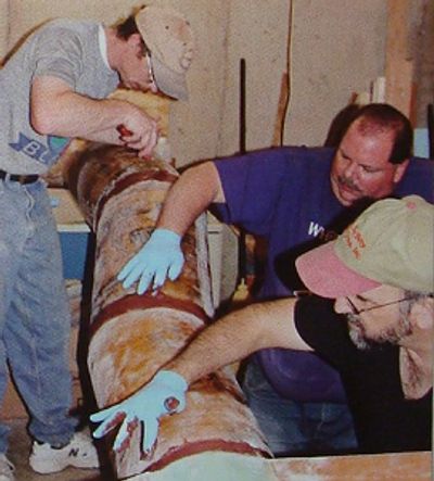 It’s lunch time. The crew adjourns to a tavern around the corner for sandwiches and beer. Even the beer didn’t help us when it came time to sand that awful primer. When the sanding was complete, most of the primer was gone. Bare fiberglass was everywhere. Our solution was to make a quick trip to the store, buy two spray cans of automotive primer, and spray the rocket. Oh, so easy. Wish we had done this five hours ago.