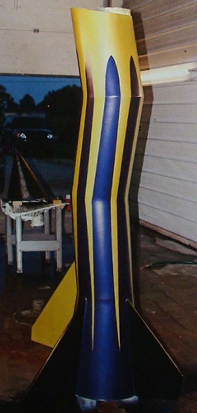 After a brief introduction, the RSO gave the 10-count, hit the button, ignition. The motor erupted into a throaty roar and sparks spewed everywhere. The A.C.M.E. rose skyward into a straight flight pattern. Shortly after motor burnout she reached apogee at 1,456 feet, arched over and spilled her chutes into the wind. As the chutes unfurled the A.C.M.E. descended to the screaming cheers of the hundreds of spectators below. Before she had even landed, a large contingent of the crew raced out into the field to retrieve her. A quick inspection showed the nose cone and altimeter bay were in perfect condition. One of the fins had popped slightly away from the body, and caused a minor ripple in the paint and the body tube. The damage was so minor, and the high from the successful mission so great, that no one seemed to care. The A.C.M.E. Spitfire had marked her place in sport rocketry history.