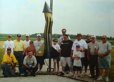 Everything is ready now, and she’s hoisted up on anxious shoulders and carried to the launch pad. With care she’s loaded onto the rail. The excitement grows as the very heavy rail and rocket are raised into position. We’re only minutes away from launch, so it’s time for the obligatory group photos. Everyone wanted these for their personal photo albums. She looks great on the pad. We’re quite honored to have Jim Flis, designer of the original kit, on hand for our launch. He looks like a proud father with a newborn child.